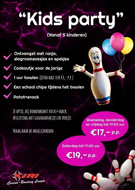 Een kids arrangement met anderhalf uur bowlen is alleen van woensdag t/m vrijdag te reserveren, zaterdag is alleen 1 uur bowlen mogelijk.