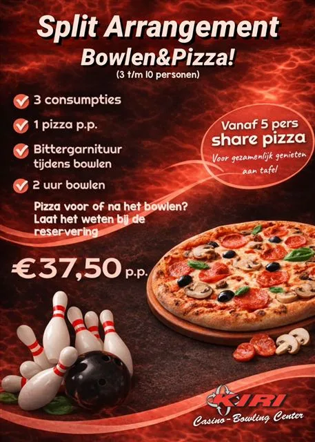 Tijdens het bowlen geniet je van een bittergarnituur en 3 consumptiemunten per persoon. Daarnaast staat er pizza op het menu: bij groepen tot 4 personen krijgt iedereen een eigen pizza. Vanaf 5 personen serveren we pizza’s om te delen, perfect om samen te genieten.
