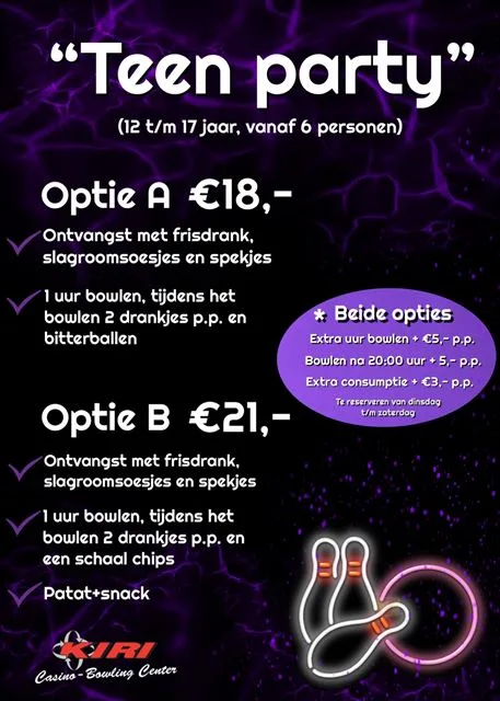 Speciaal voor de oudere kinderen hebben wij een leuk arrangement samengesteld om zijn of haar feest bij Kiri Bowling Hoogeveen te vieren.